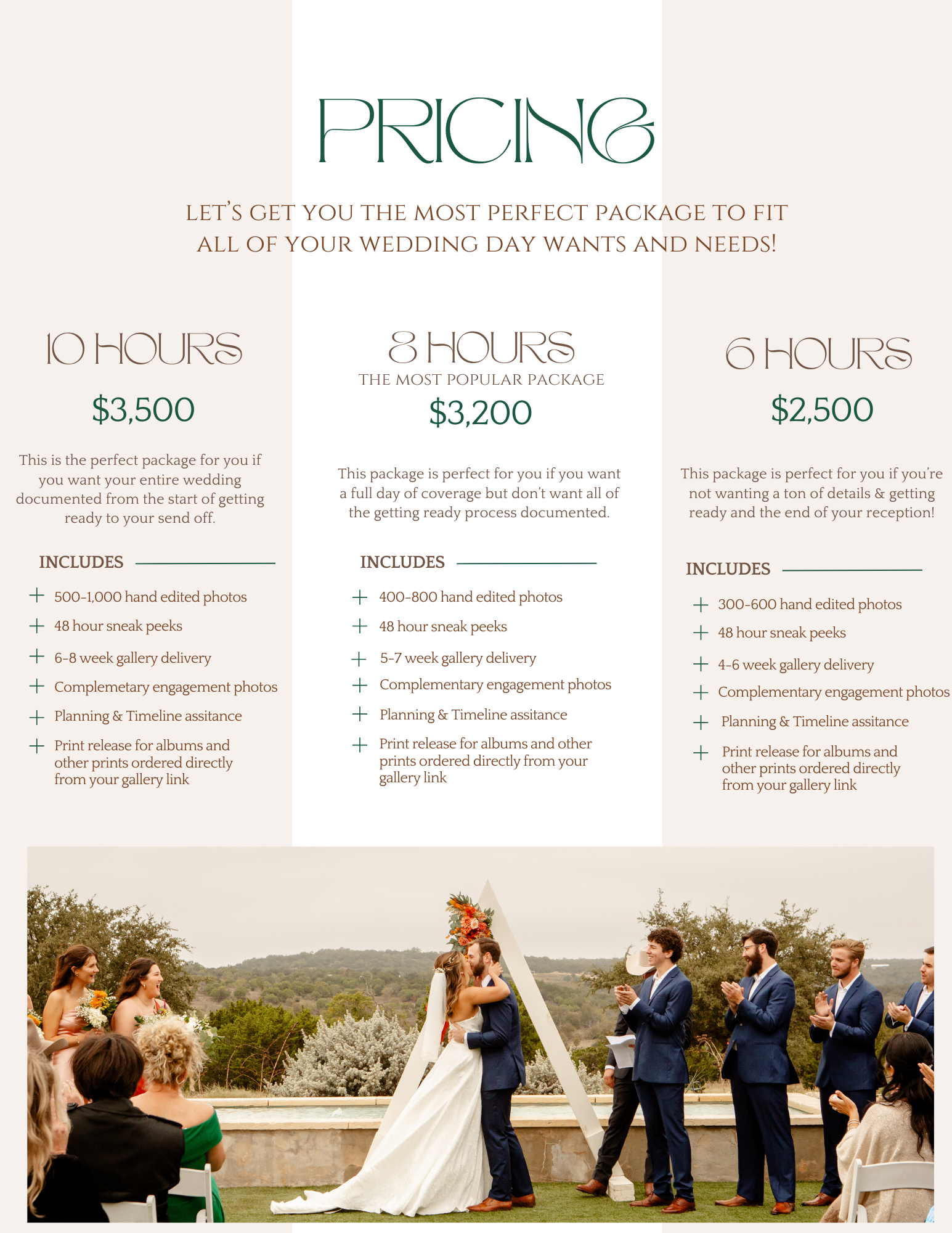 I offer a 6 hour package for $2,200 which includes around 75+ photos per hour, edited sneak peeks delivered within 2 days after your wedding, and the full wedding gallery delivered 2-3 weeks after your wedding. My pricing goes up to $3,500 for 12 hours of coverage, with engagement photos included in my 10 and 12 hour package.