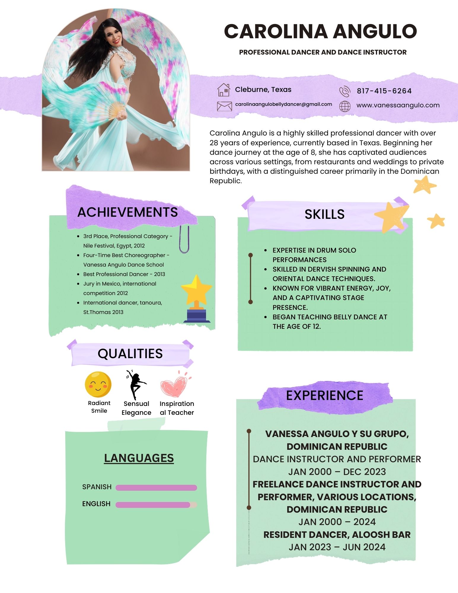 Carolina Angulo is a highly skilled professional dancer with over 28 years of experience, currently based in Texas. Starting her dance journey at the tender age of 8, Carolina has captivated audiences across various settings, from restaurants and weddings to private birthdays, with a notable career primarily based in the Dominican Republic.