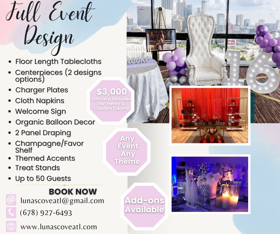 Luna's Cove offers affordable luxury full event designing services and equipment rentals to the Metro Atlanta Area and beyond! We are spanish speaking, black & latina owned as well as LGBTQ+ friendly. From Baby Showers, Quinceaneras& Sweet 16s to Weddings! We would love to be a part of your core memories. Our packages can cater to any event type OR create your own package based on wants, needs & budget. All theme are welcomed! Contact us today for more quotes and details! Looking forward to working with you and HAPPY PLANNING!