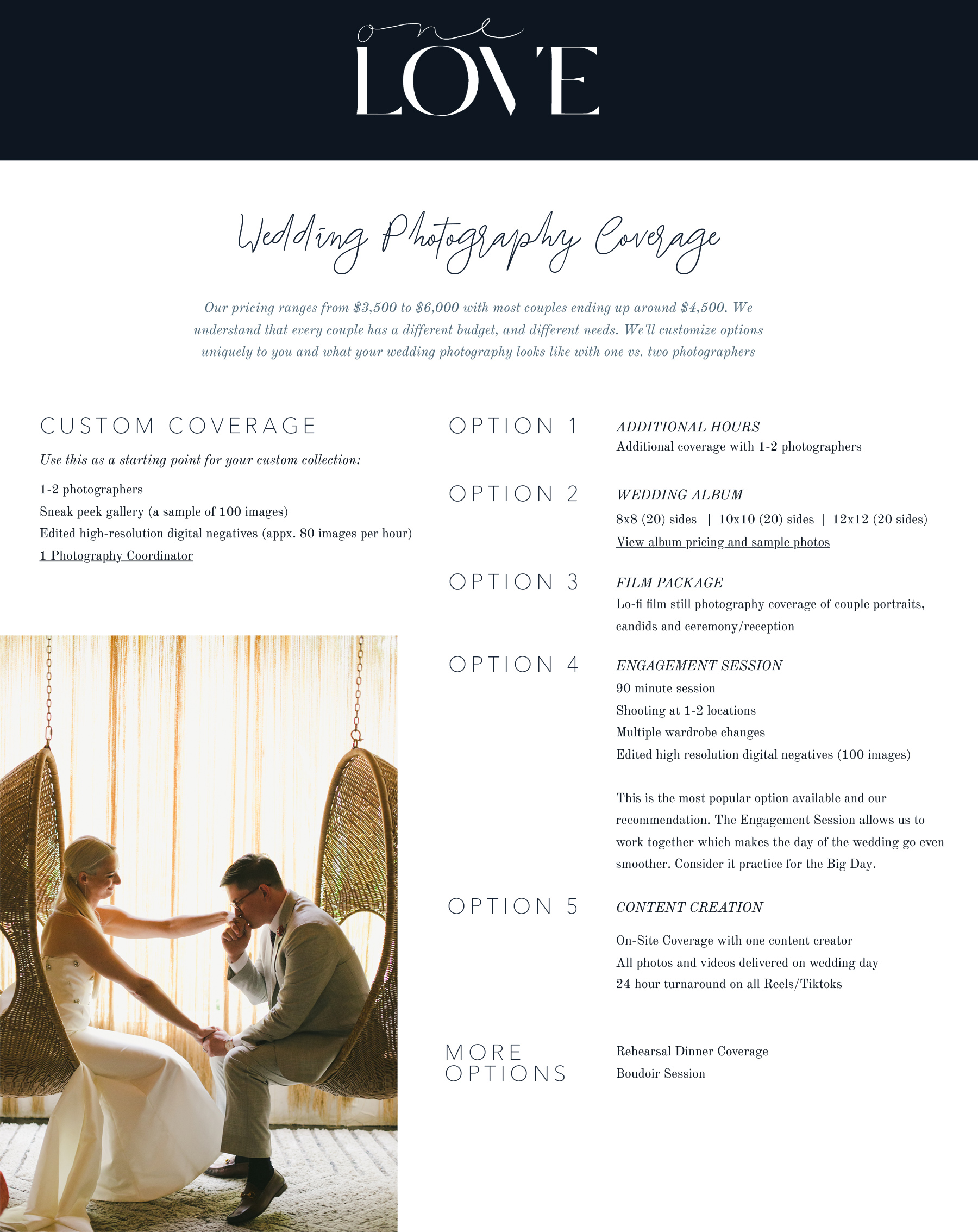 - We understand that every couple has a different budget and different needs. We'll customize options uniquely to you: considering your guest count, wedding party size, and what coverage looks like with one vs. two photographers. View our options here: https://www.onelove-photo.com/coverage